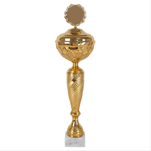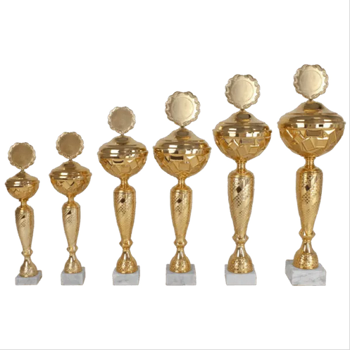 Beker met goudkleurige metalen cup, deksel en topstuk. Goudkleurig kunststof tussenstuk.