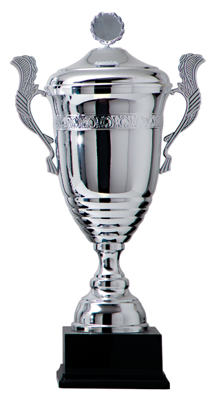 Beker uitgevoerd in metaal zilverkleur, met oren en deksel.