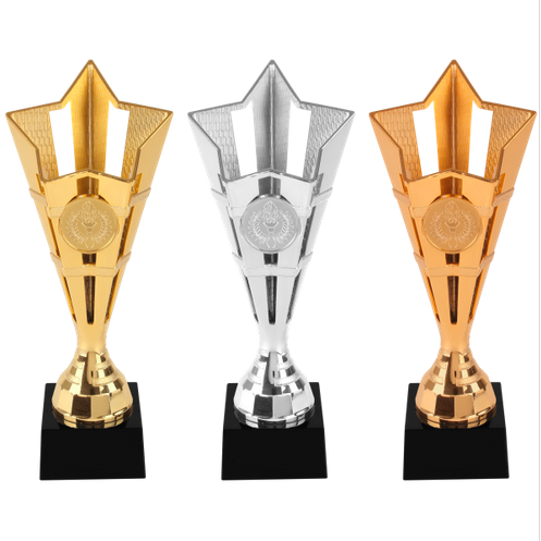 Kunststof trofee in goud-, zilver- of brons kleur verkrijgbaar.