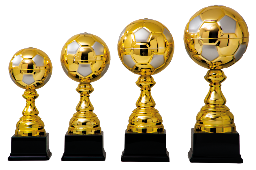 Voetbal trofee, kunststof voetbal uitgevoerd in goudkleur met zilverkleur accenten.