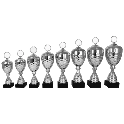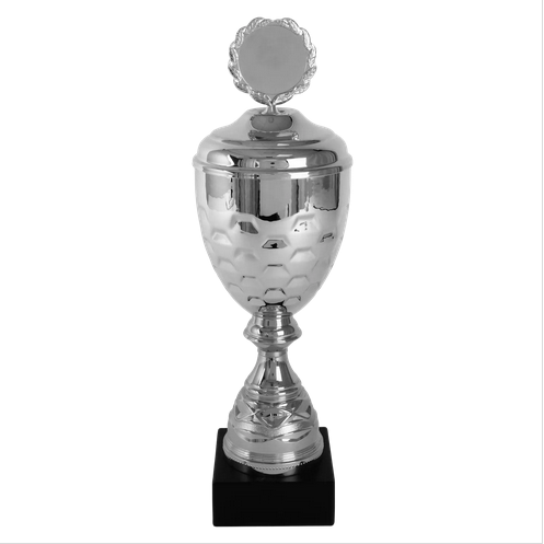 Beker met zilverkleurige metalen cup, deksel en topstuk, zilverkleurig kunststof tussenstuk.