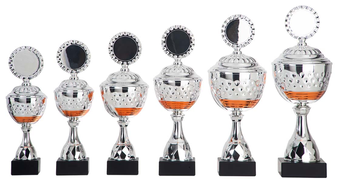 Beker in zilverkleur met oranje kleur accent op kelk van de beker, gemonteerd op zwart stenen voet.