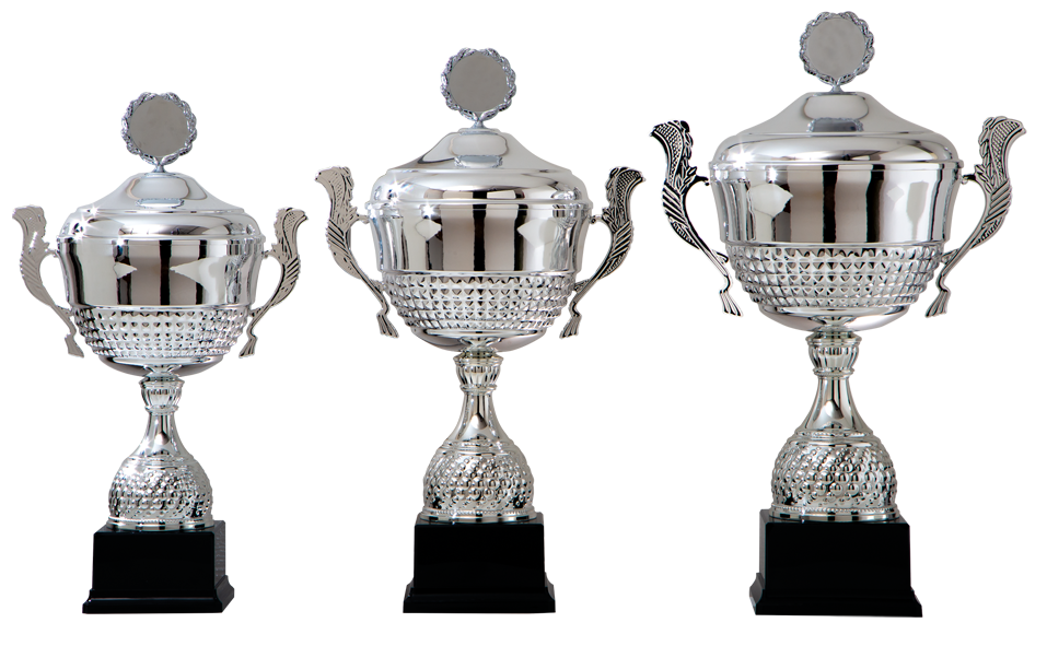 Beker in zilverkleur met metalen cup, oren en kunststof onderstuk.