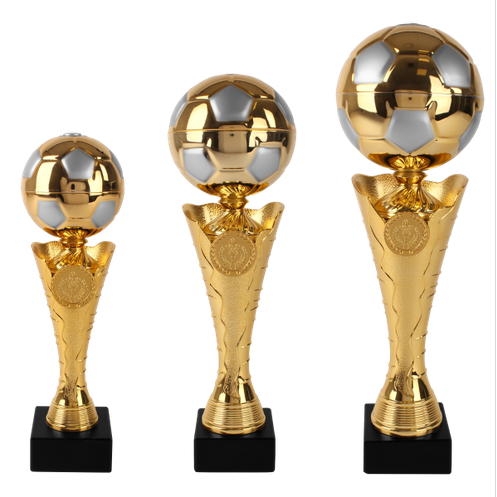Voetbal trofee met kunststof tussenstuk en metalen voetbal in goud- en zilverkleur.