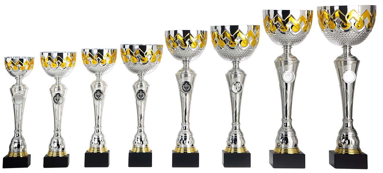 Zilverkleurige beker met metalen cup met goud accent, zilverkleurig kunststof tussenstuk en goudkleurige ring boven de voet.