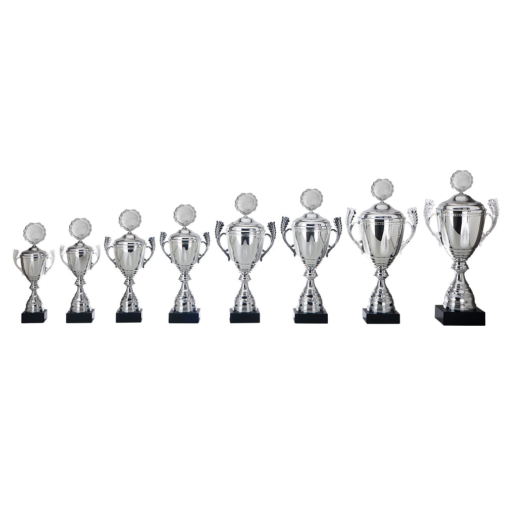 Beker in zilverkleur met kunststof cup. Topstuk en deksel van metaal, zilverkleur, tussenstuk in zilverkleur.