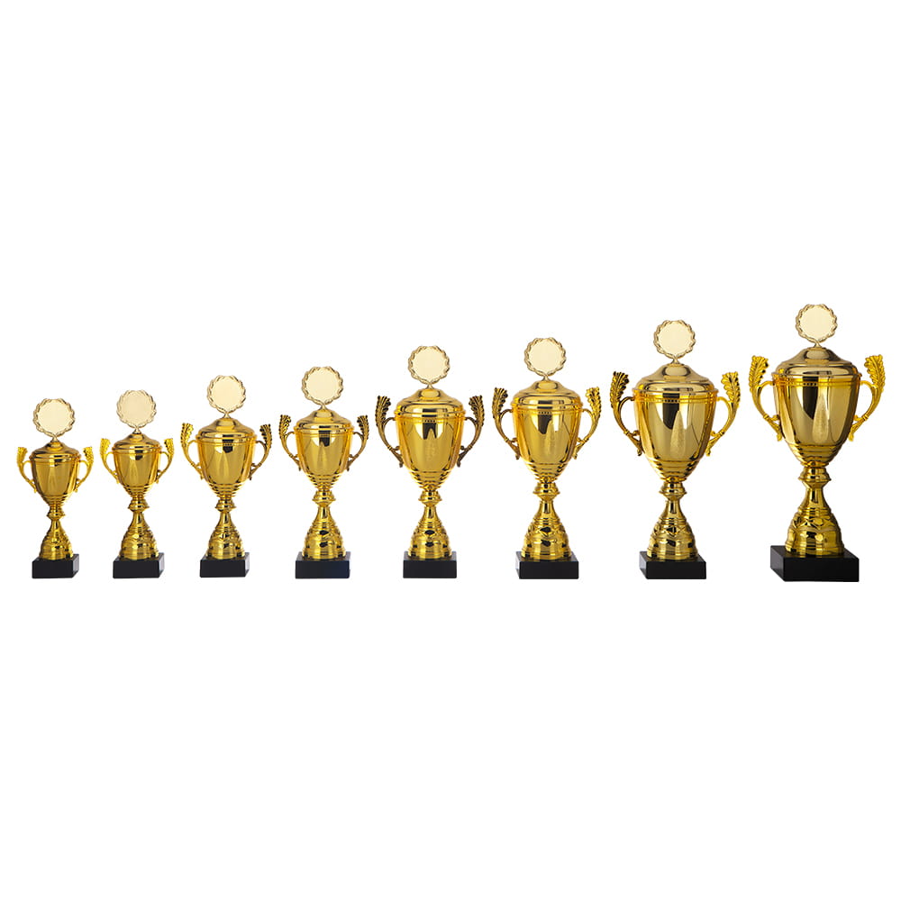 Beker in goudkleur met kunststof cup. Topstuk en deksel van metaal, goudkleur, tussenstuk in goudkleur.