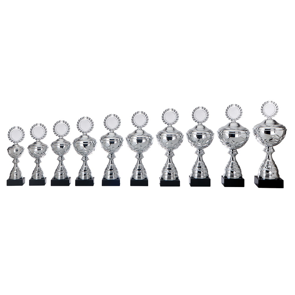 Beker in zilverkleur met metalen topstuk, deksel en cup.
