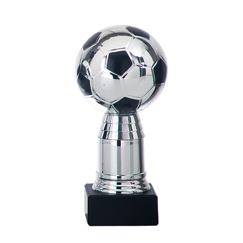 Voetbal in zilverkleur gemonteerd op zwarte marmer voet.