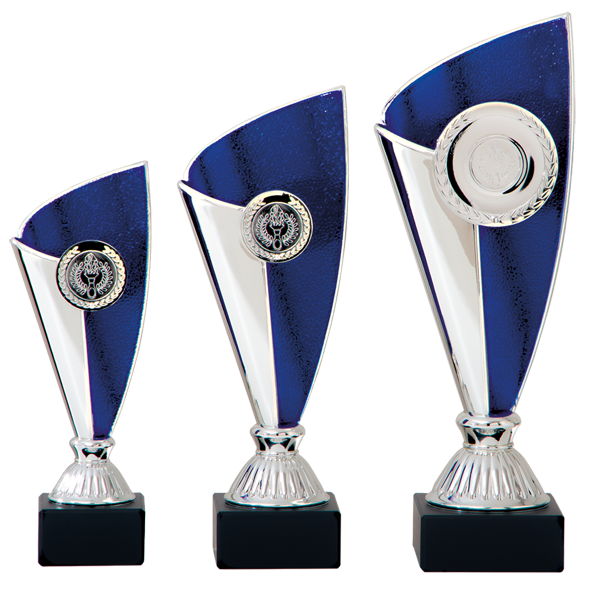 Fraaie kunststof trofee, uitgevoerd in zilverkleur met blauwe binnenzijde.