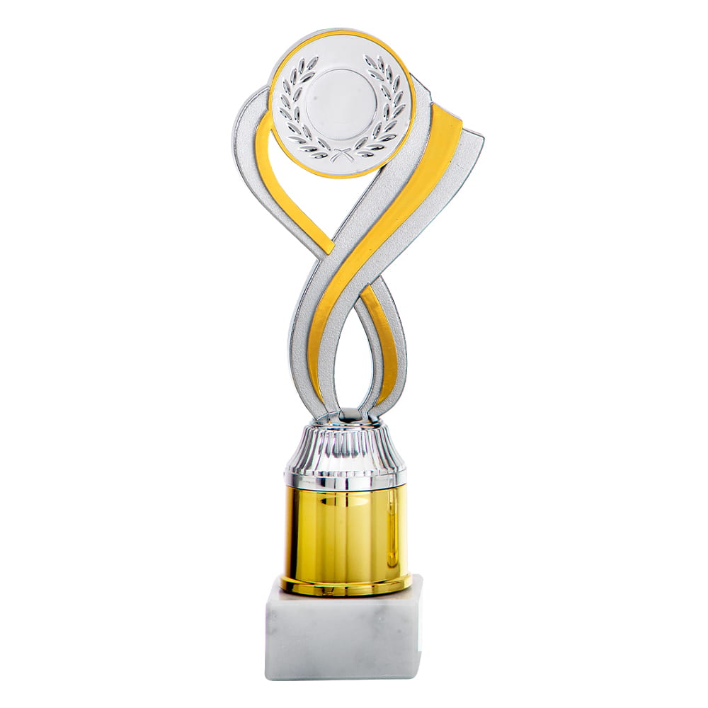 Kunststof trofee in zilverkleur met goudkleur accenten.