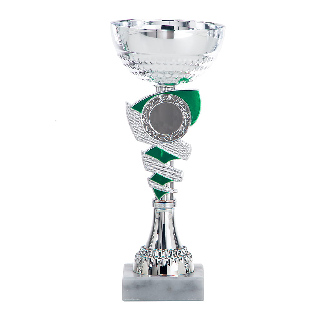 Beker in zilverkleur met metalen cup, kunststof tussenstuk in zilverkleur met groen accenten.