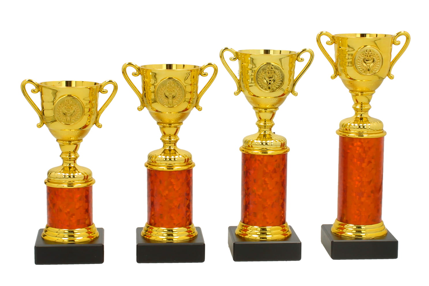 Kunststof trofee in goudkleur met rood tussenstuk.