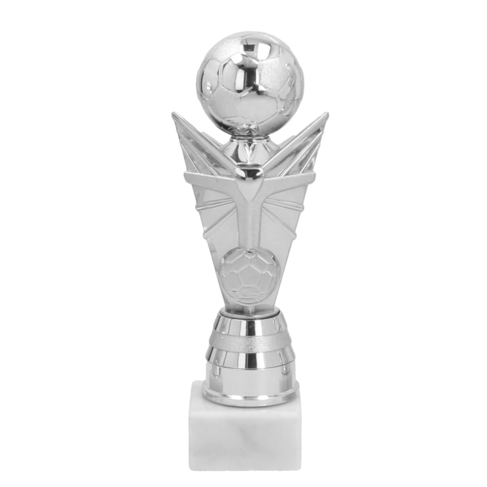 Kunststof voetbaltrofee in zilverkleur met zilverkleurig tussenstuk.