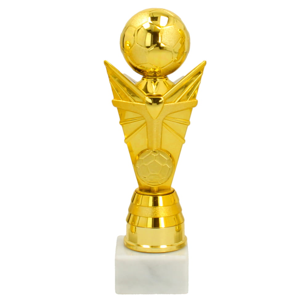 Kunststof voetbaltrofee in goudkleur met goudkleurig tussenstuk.