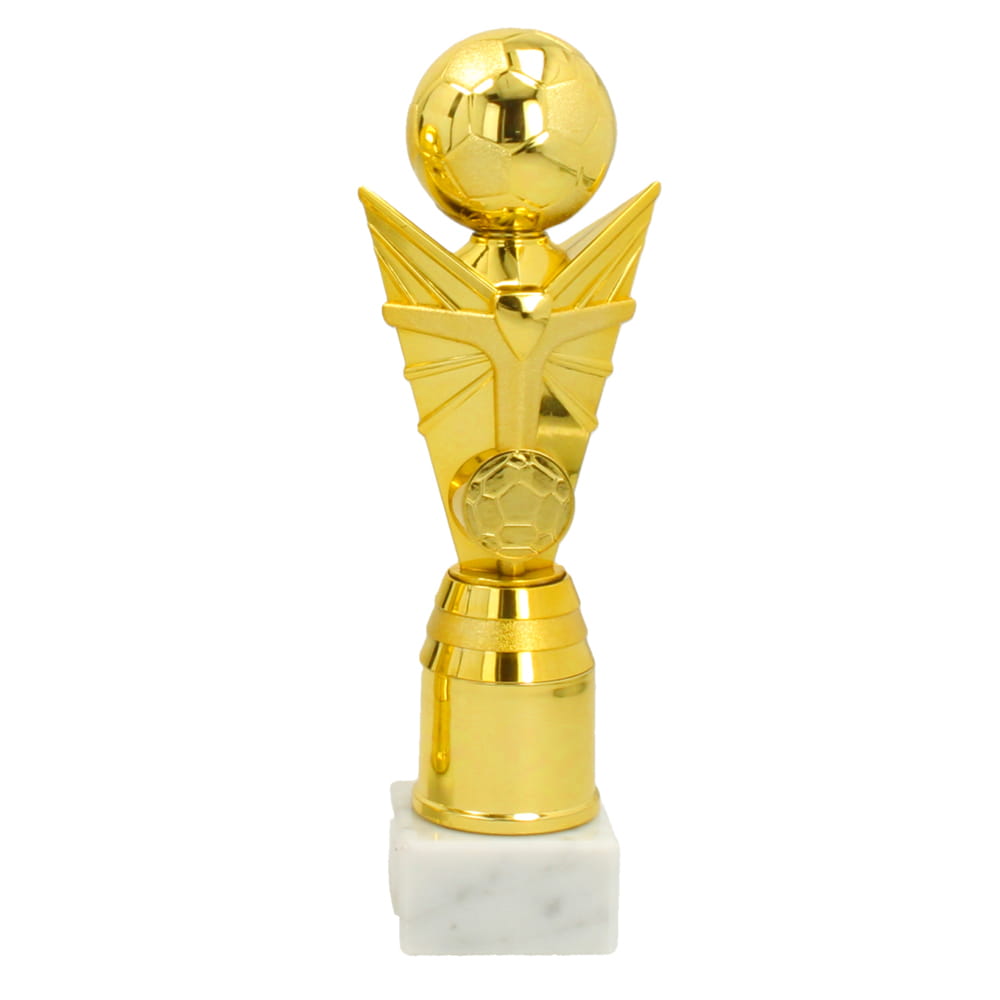 Kunststof voetbaltrofee in goudkleur met goudkleurig tussenstuk.